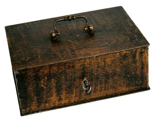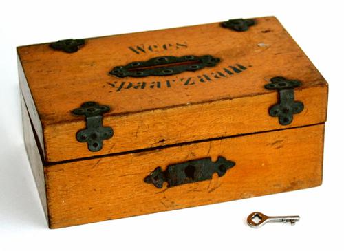 Spaarkistje. Vurenhouten kistje met metalen klampen...