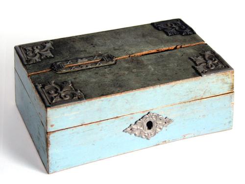 Geldkist. Licht blauw langwerpig houten kistje met...