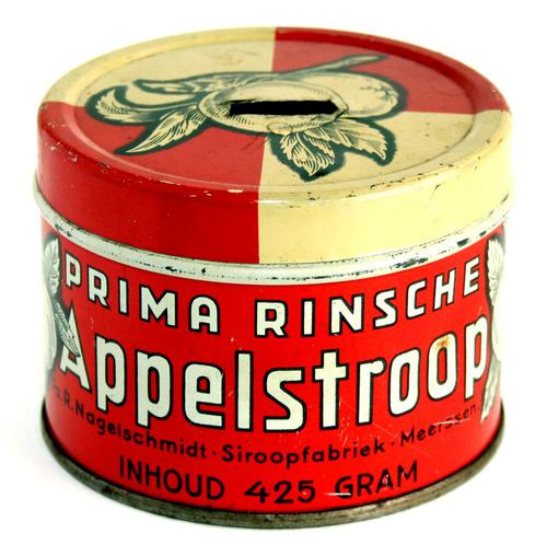 Spaarblikje, ‘PRIMA RINSCHE APPELSTROOP’ Rond metal...