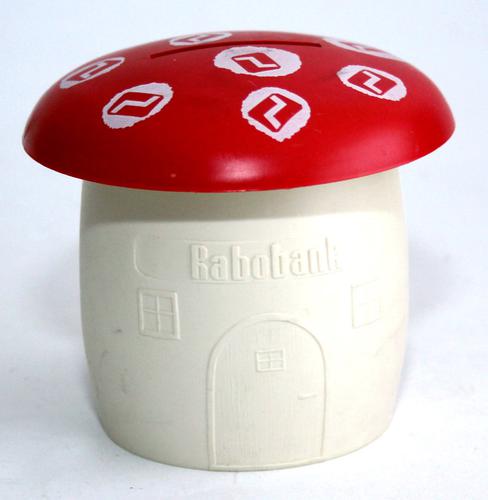 Spaarpot. ‘Rabobank’ Plastic spaarpot als paddenstoel.
