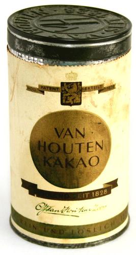 Spaarblikje Van Houten Kakao. Metalen blikje met pa...
