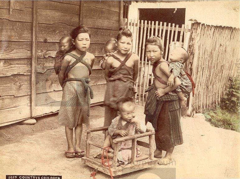 Man met drie jonge acrobaatjes, Japan (1881-1914)