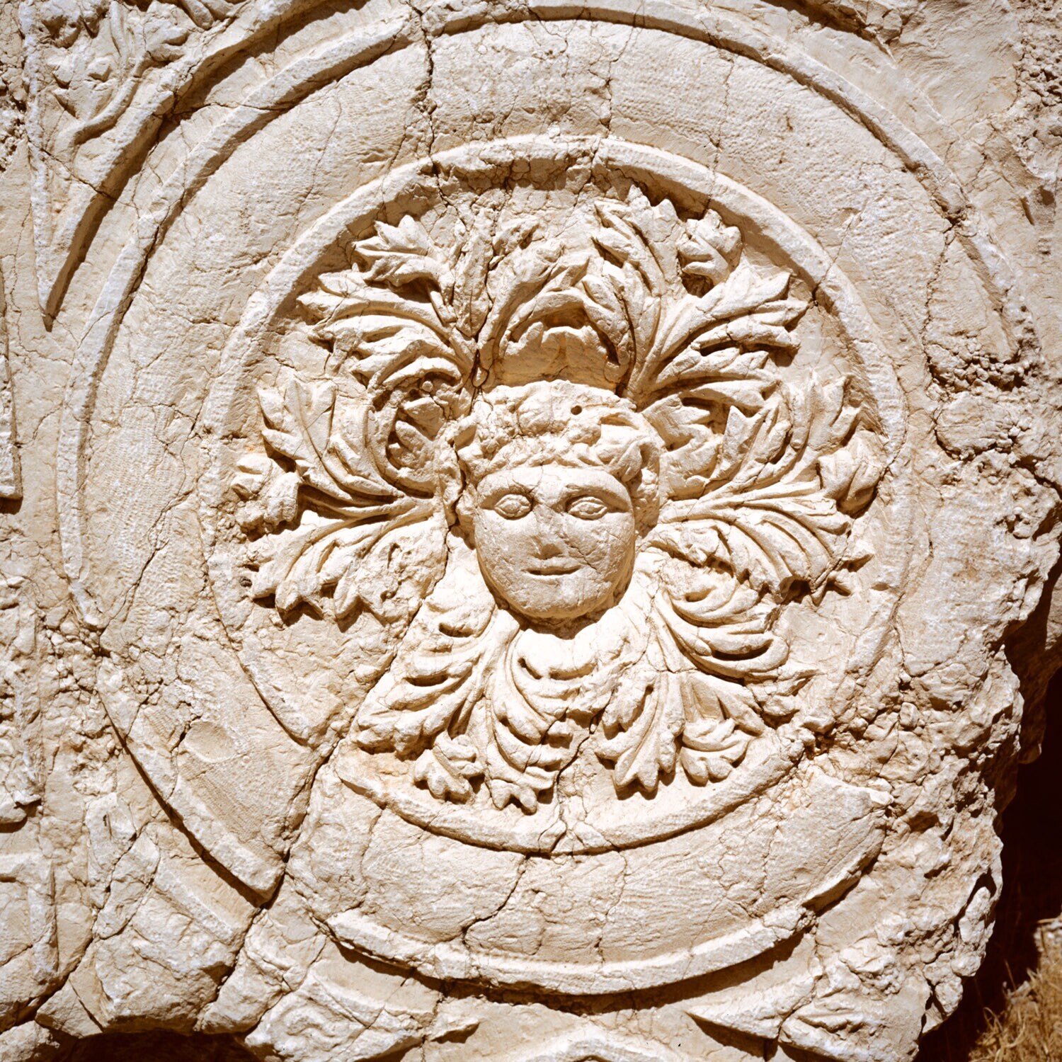 Detail van een reliëf van een hoofd in een rozet van...
