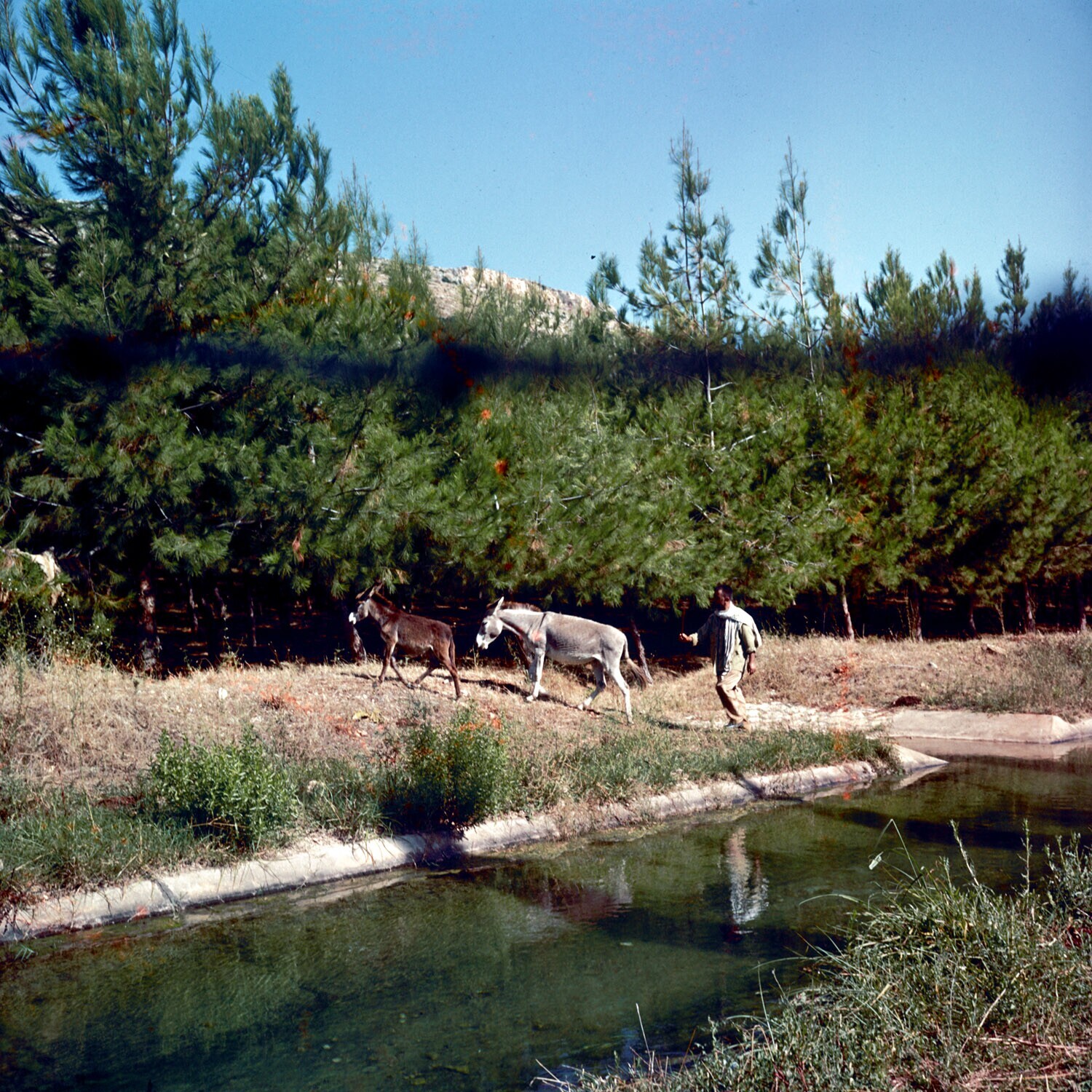 Een boer met 2 ezeltjes langs een kanaal in de kusts...
