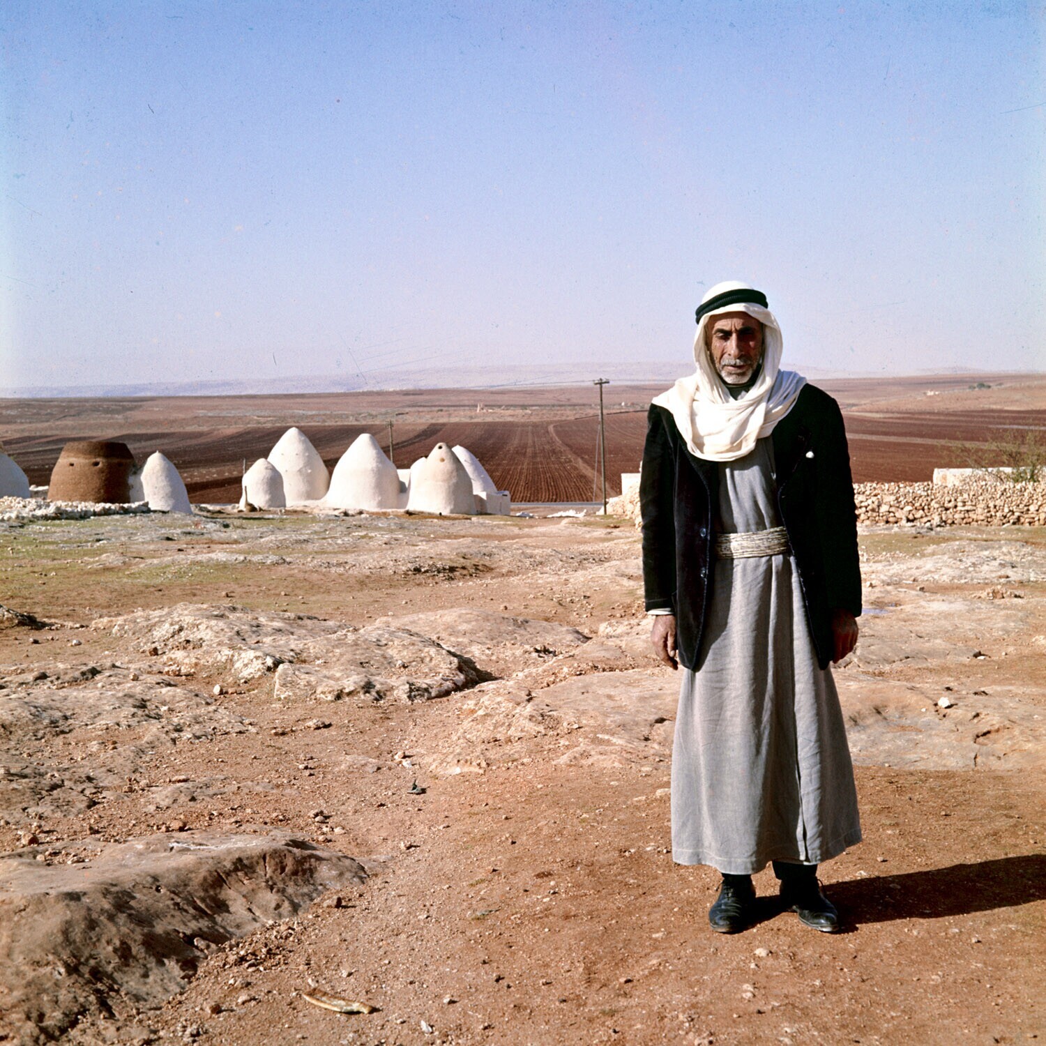 Man standing in front of a village and fields