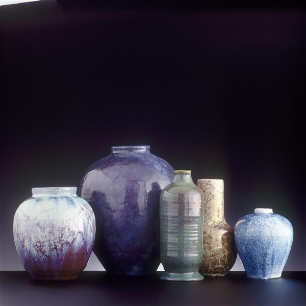 Vijftal bolle en cilindriche vaasvormen in blauw, gr...