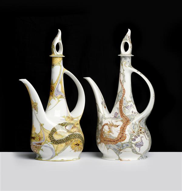 Tweetal koffiekannen met pluimdeksel en decors respe...