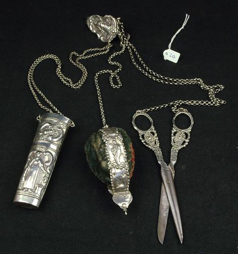 Chatelaine met schaar, speldenkussen en naaldenkoker...