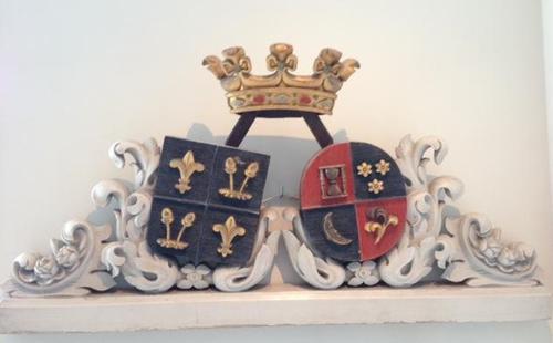 Ornament van een kerkbank met familiewapens Van Helo...