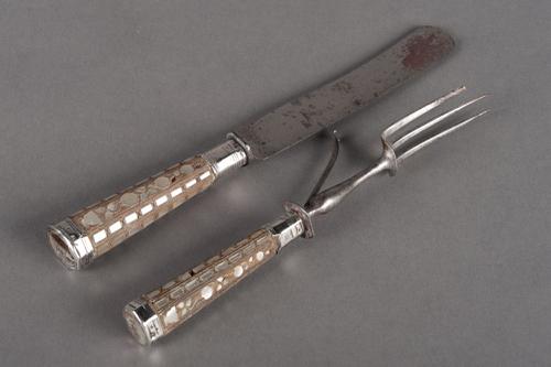 Zilveren vleesvork met parelmoer heft