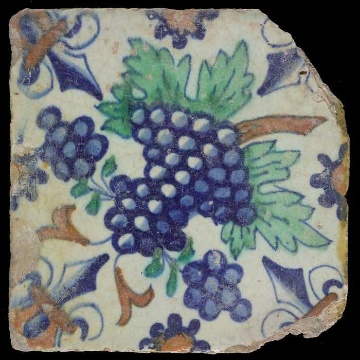 Ornamenttegel met grote druiventros, hoekmotief lelie