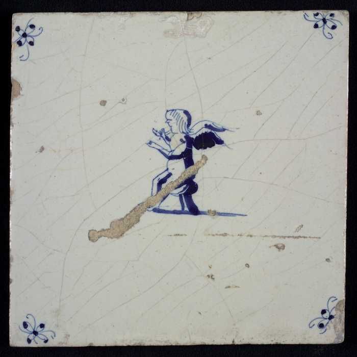 Figuurtegel, lopende engel of putto, blauw decor op ...