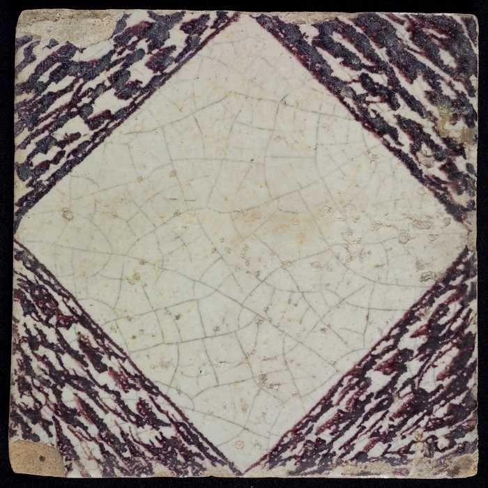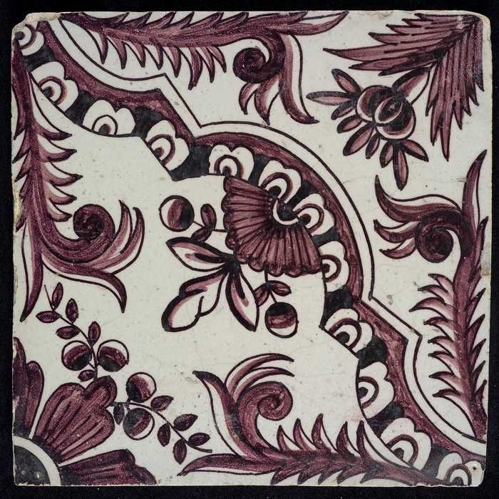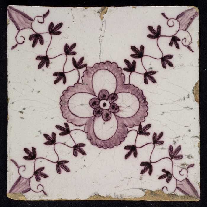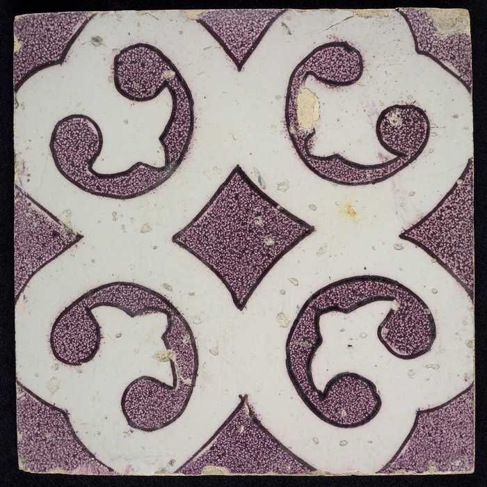 Ornamenttegel, paars op wit, kruisroos, hoekmotief o...