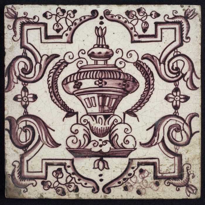 Ornamenttegel, vaas in omlijsting van hoeken en krul...