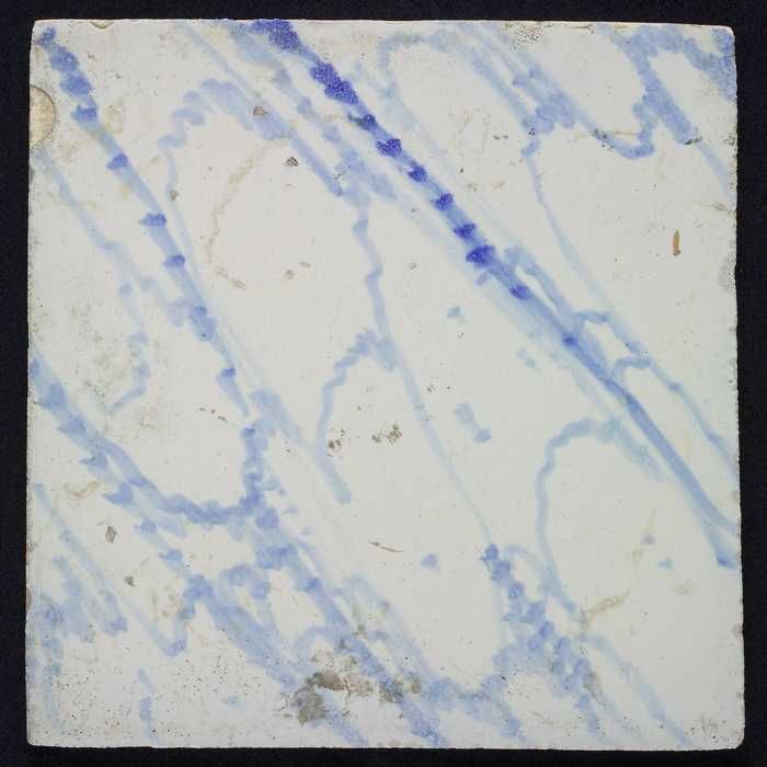 Marmertegel, diagonaal gemarmerd, blauw decor op wit...
