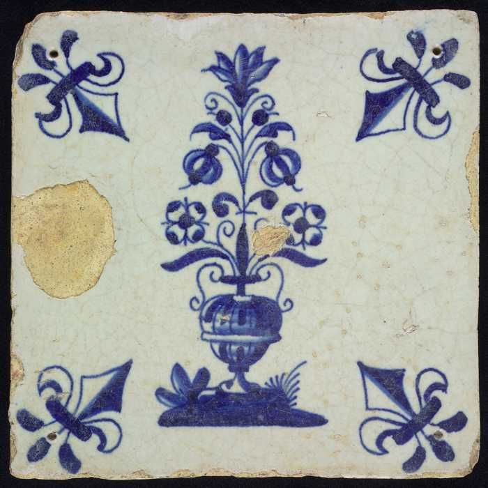 Bloemtegel met grote bloempot, blauw decor op wit fo...