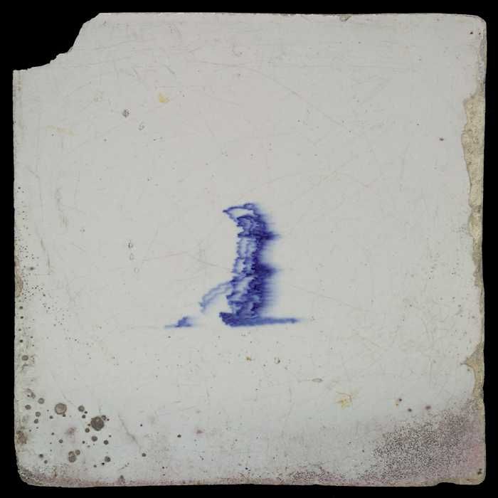 Figuurtegel, blauw, man met iets in de hand, hoekmot...