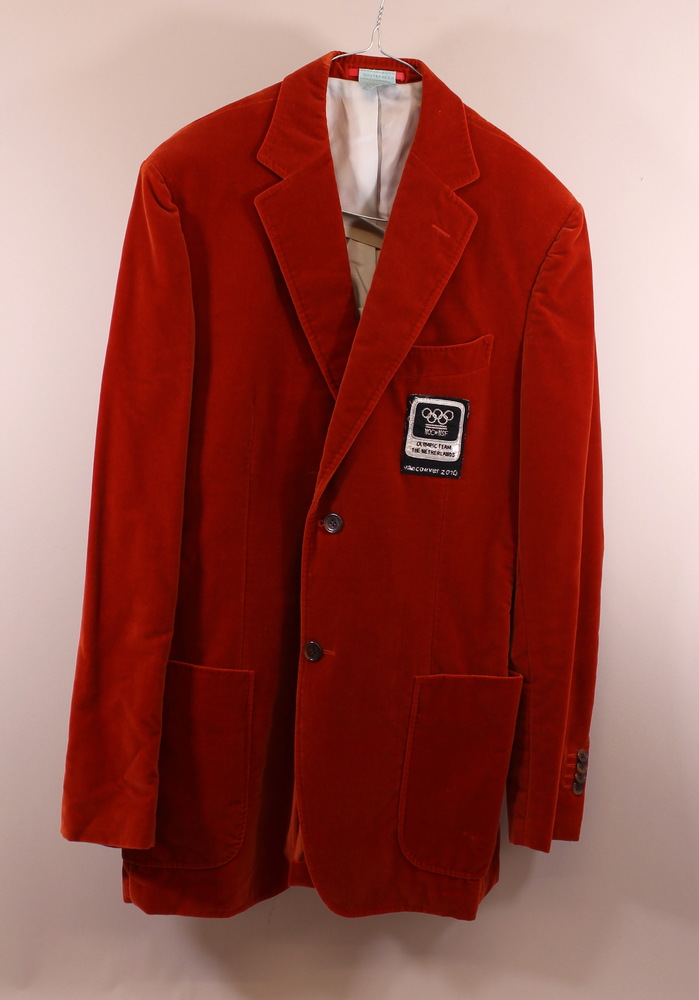 Donkeroranje fluwelen colbertjasje. Olympische Winte...