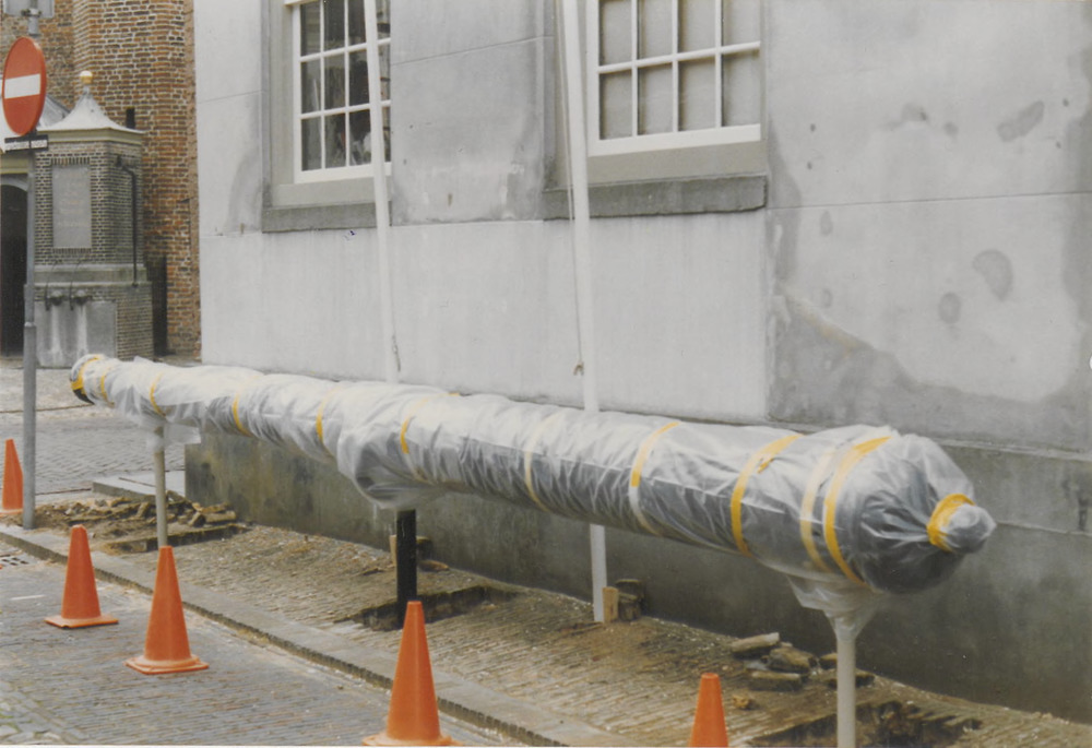 Nogmaals de replica van het kanon geheel ingepakt ge...