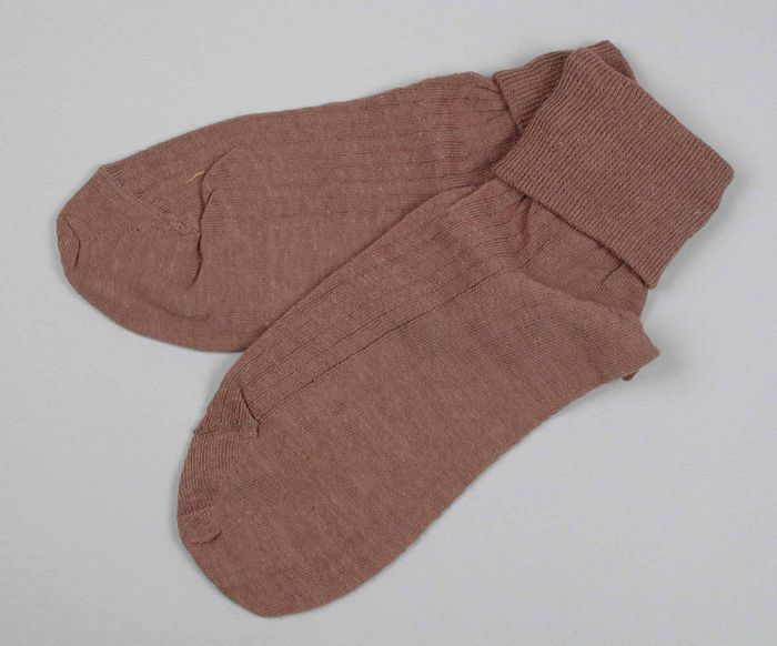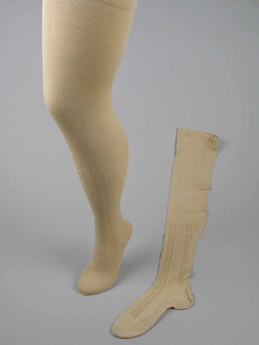 Paar lange beige kousen van fijn tricot katoen met k...