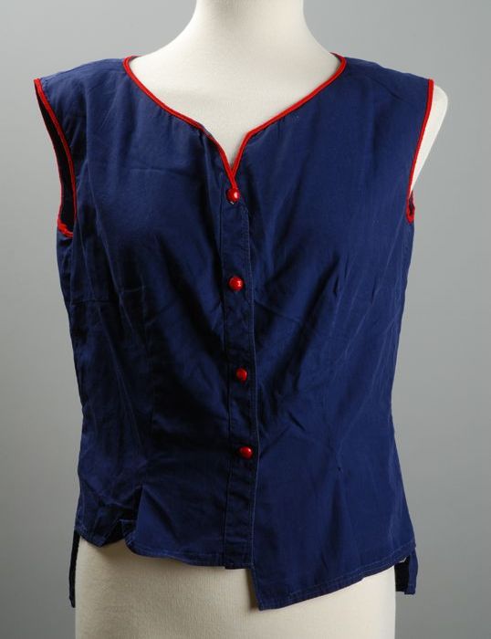 Blouse, donkerblauwe katoen, rode bies, rode knopen,...
