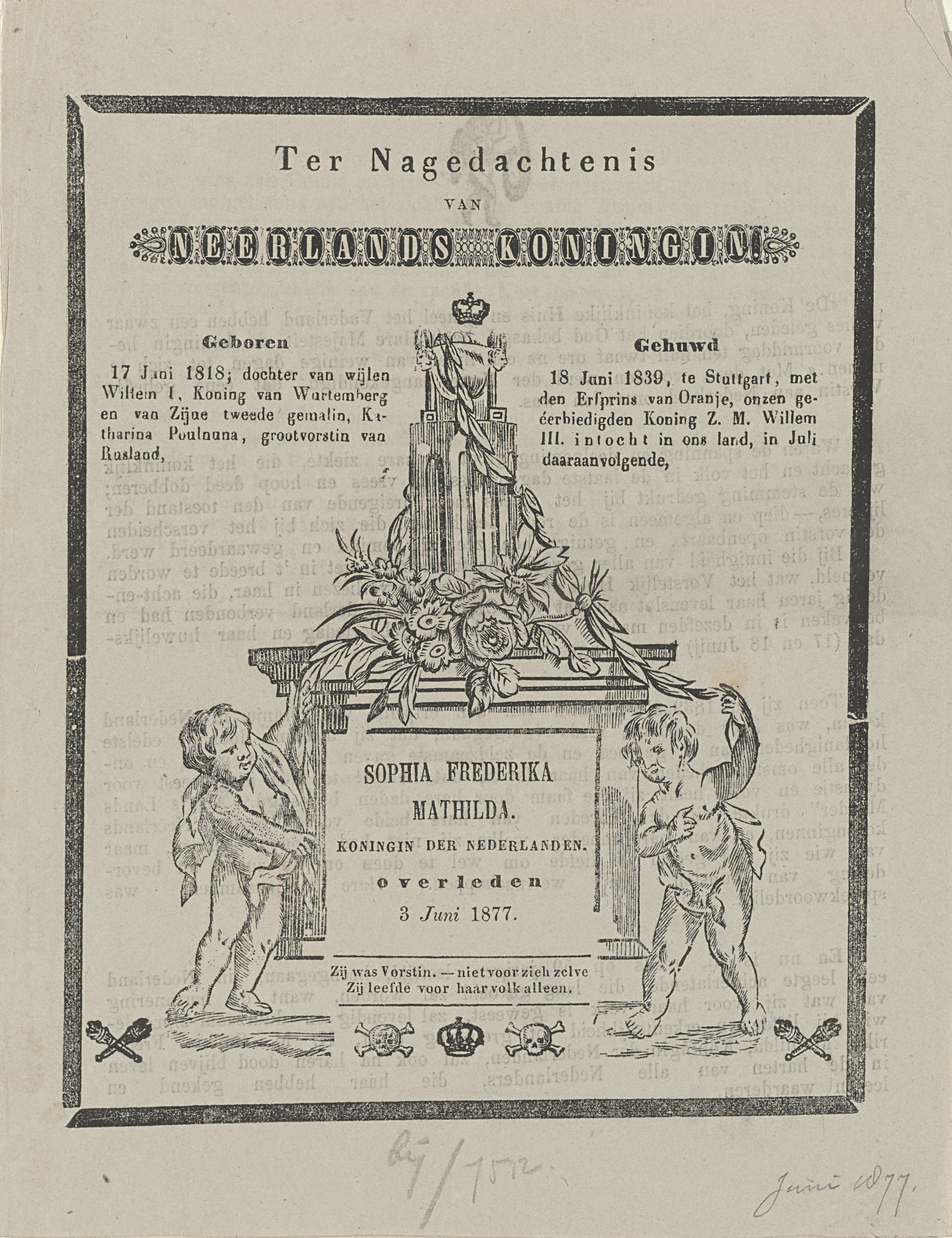 Blad ter nagedachtenis aan koningin Sophia, 1877