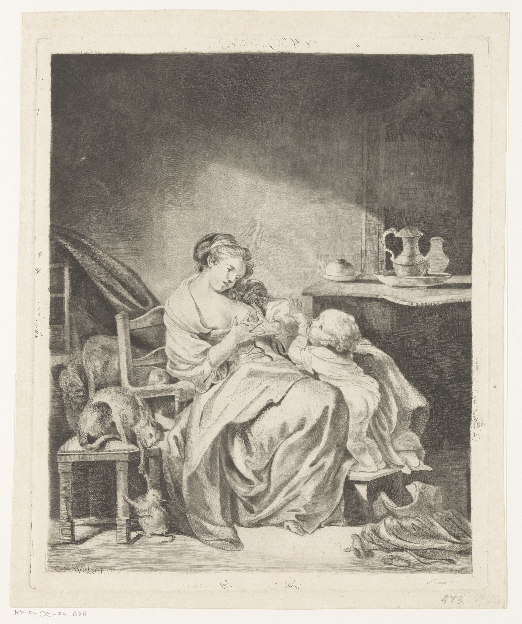 Interieur met een zittende vrouw die haar kind voedt