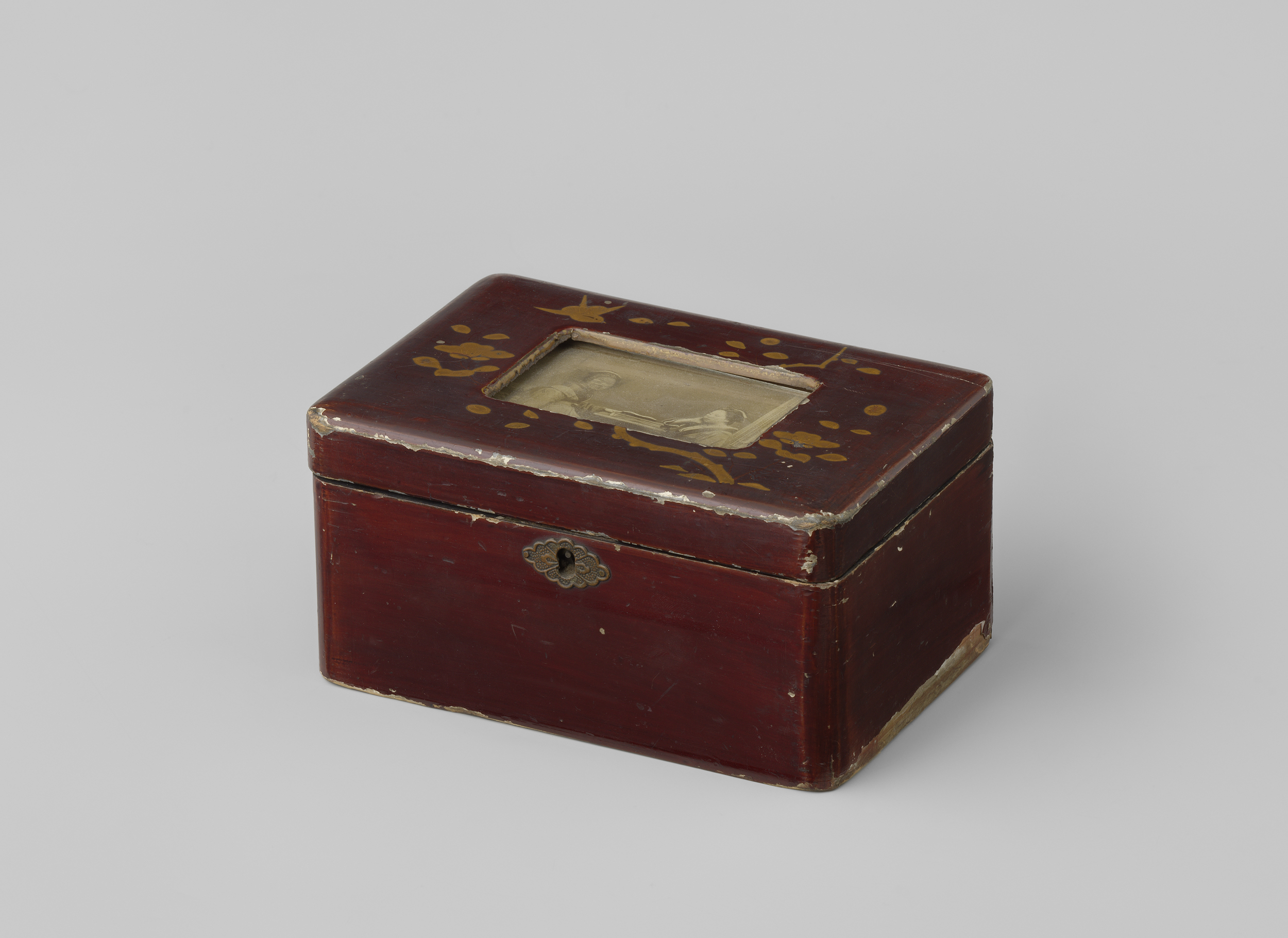 Rood Japanse lak-doosje met albuminedruk op de deksel