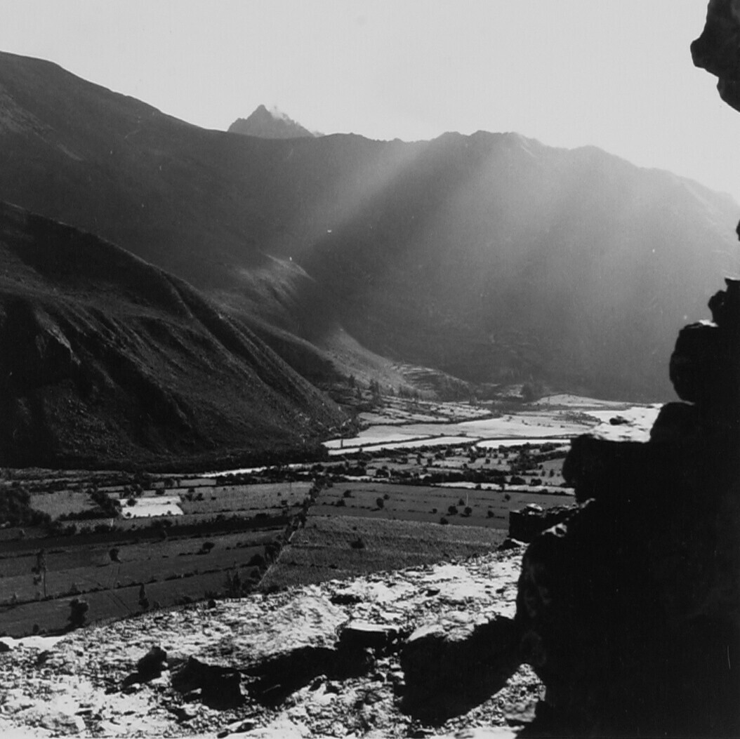 Ruïnes van Ollantaytambo met op de achtergrond het d...