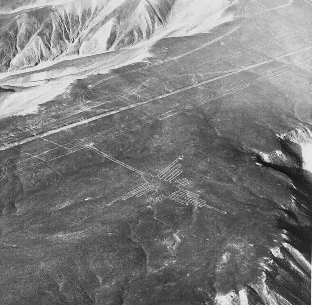 Luchtopname van de Nasca lijnen. Hier de kolobri