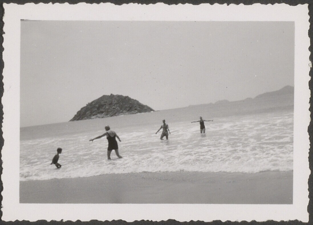 Vier figuren in zee aan het strand bij Shek O, Hong ...