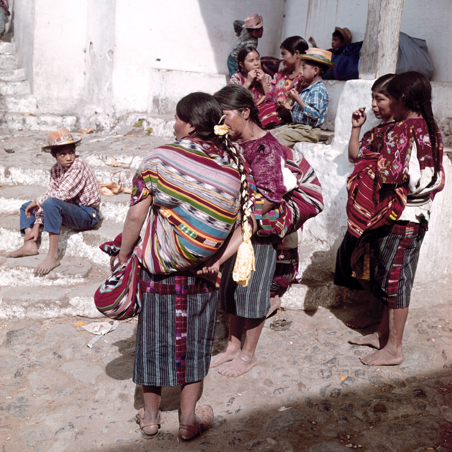 K'iche' vrouw met kind op de trappen van de Iglesia ...