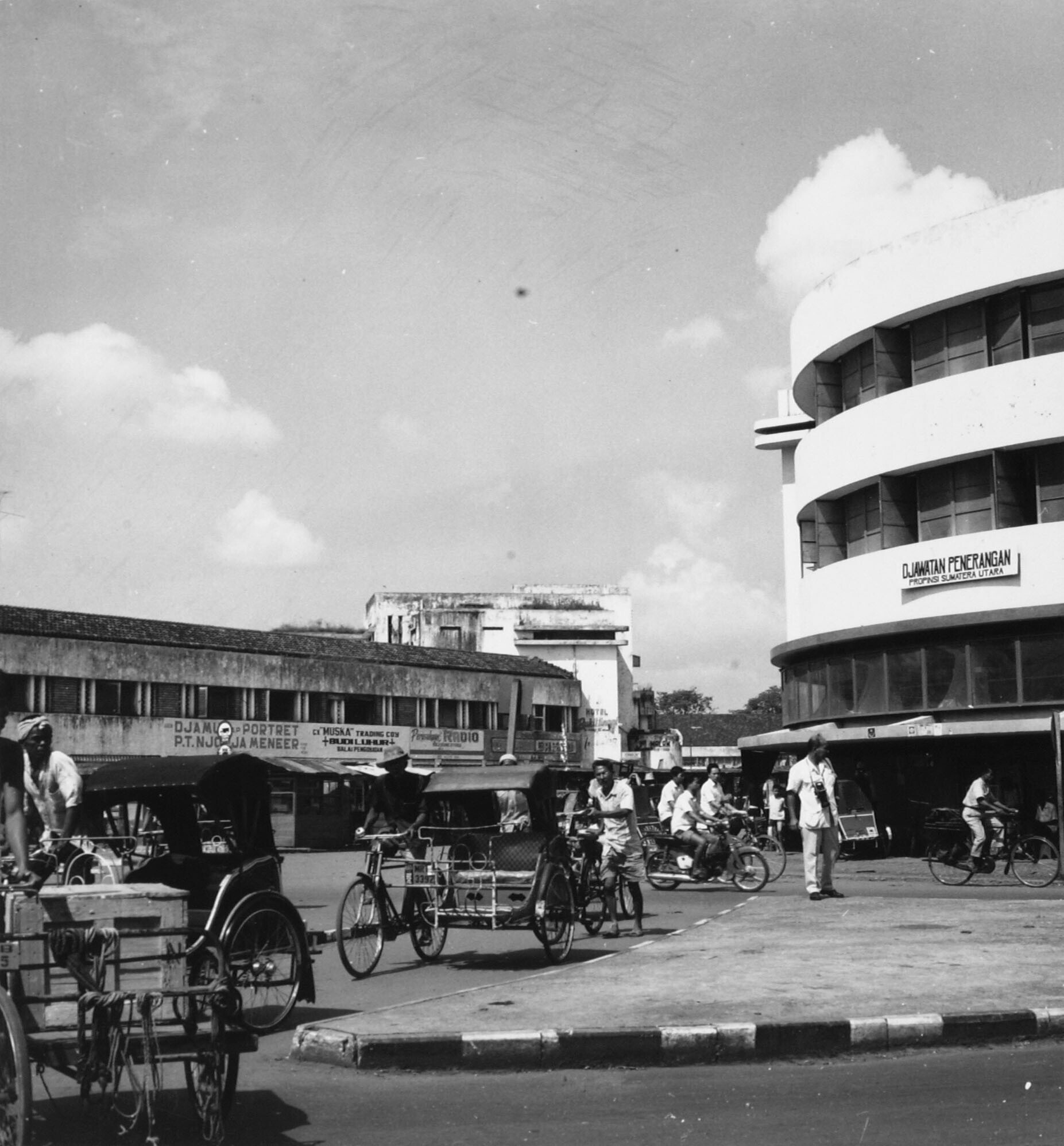 Straatgezicht met betjakrijders en geparkeerde auto'...