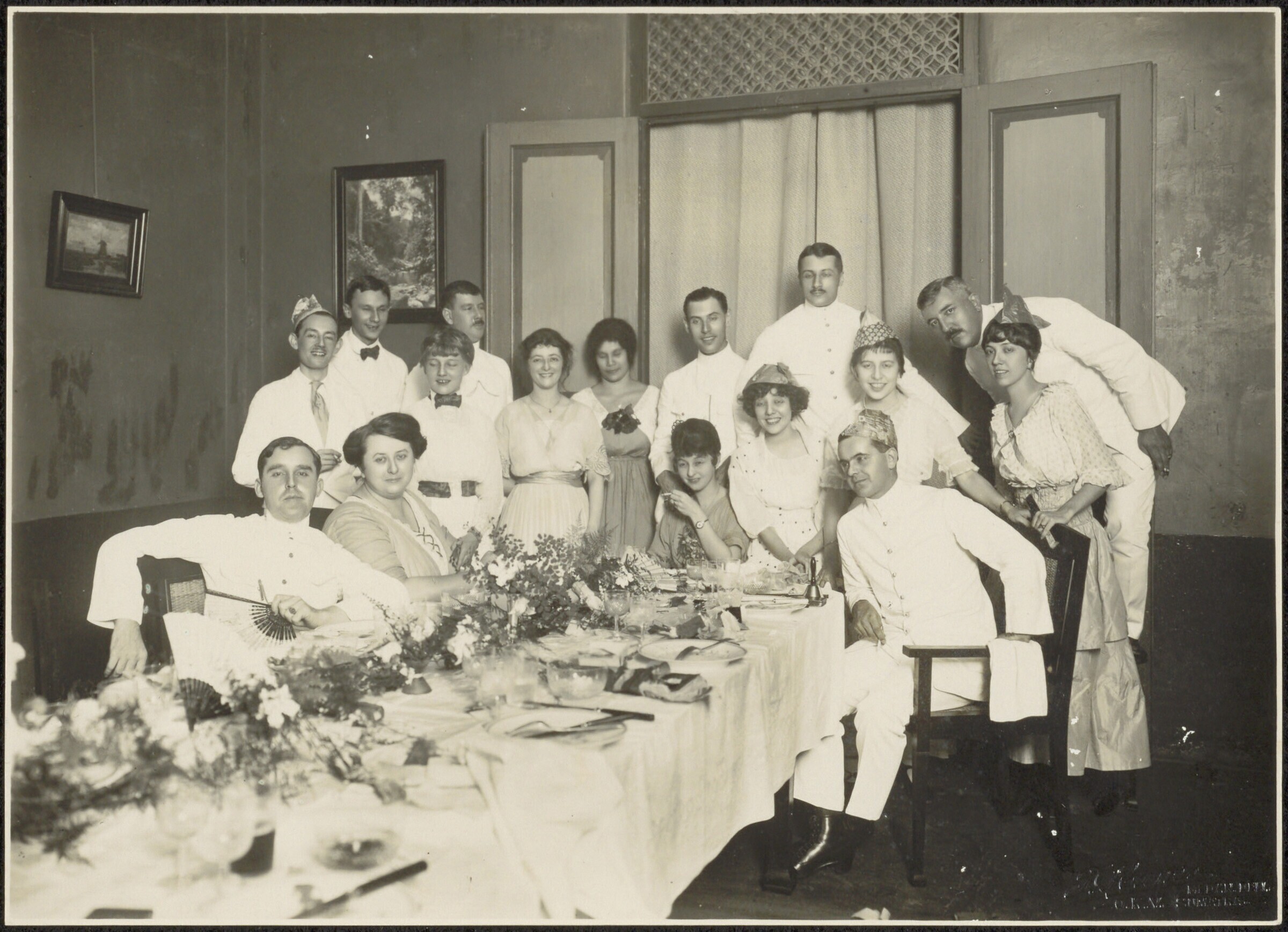 Groepsportret bij een gedekte tafel met feesthoedjes