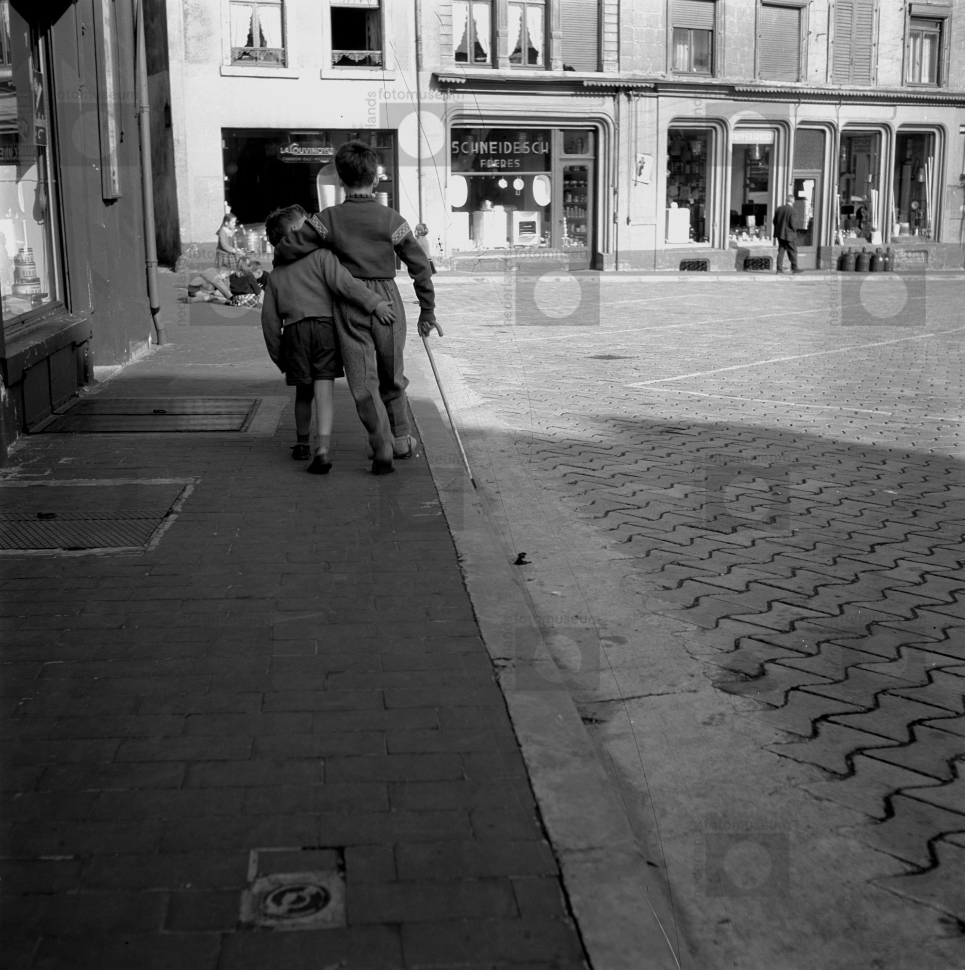 Frankrijk. Twee jongens lopen op straat. Jongen met ...