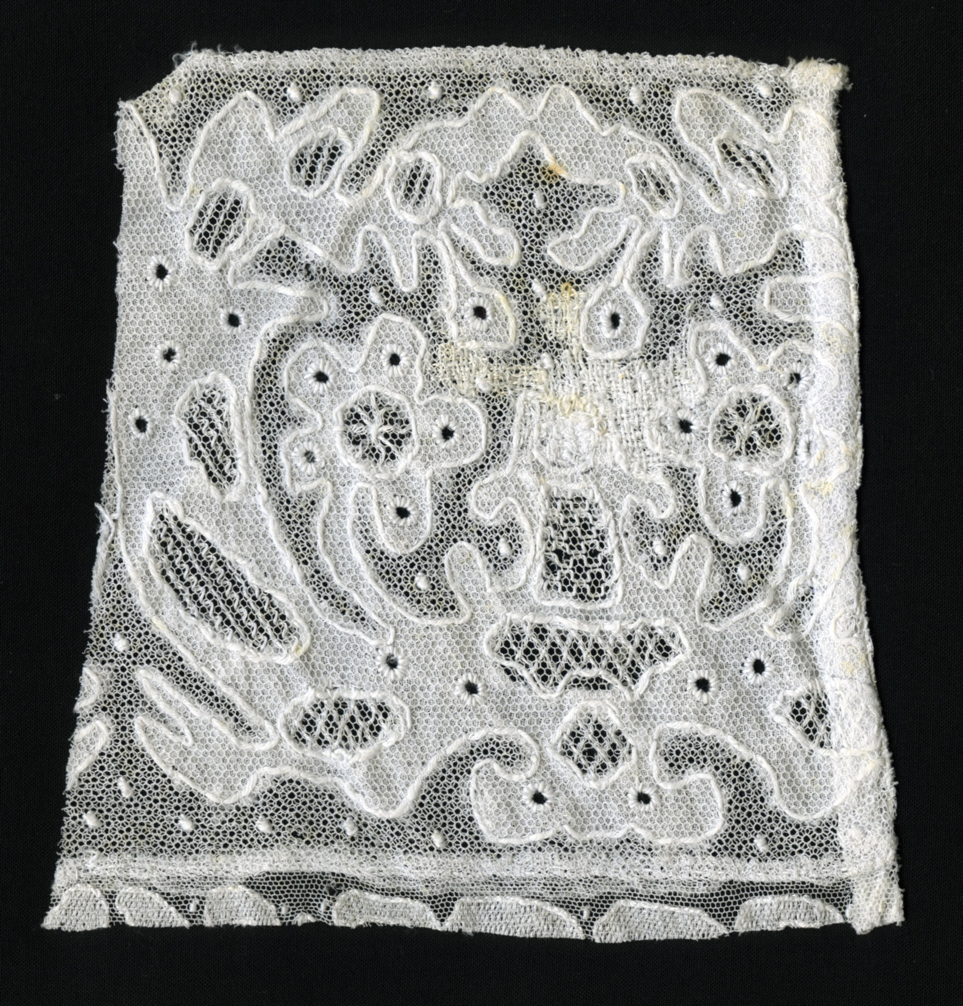 Stofstaal van een 'pluumkant' van muts, Zuid-Bevelan...