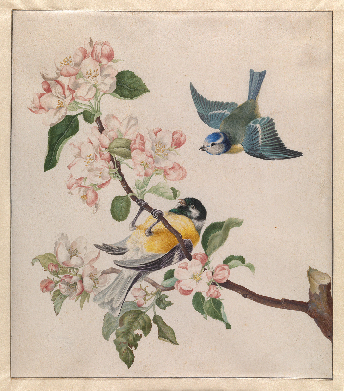Een koolmees en een pimpelmees bij een tak appelbloesem