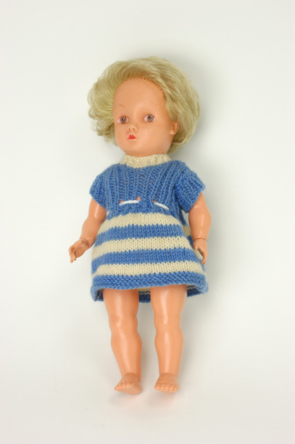 Pop met blond kort haar, blauw gebreid jurkje en wit...