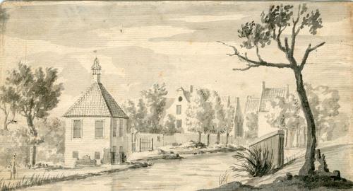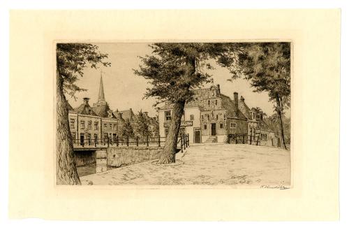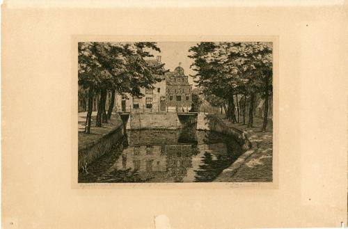Ets van een gracht met het Korendragershuisje in Fra...