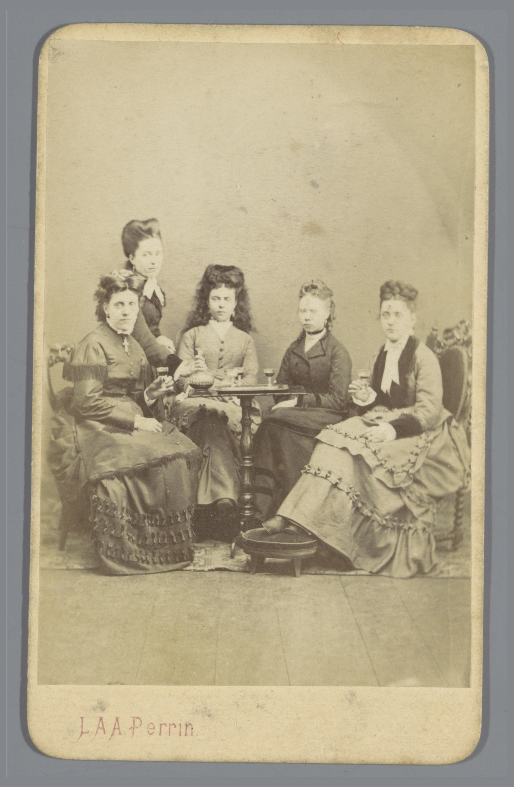 Groepsportret van vijf onbekende vrouwen rond een tafel