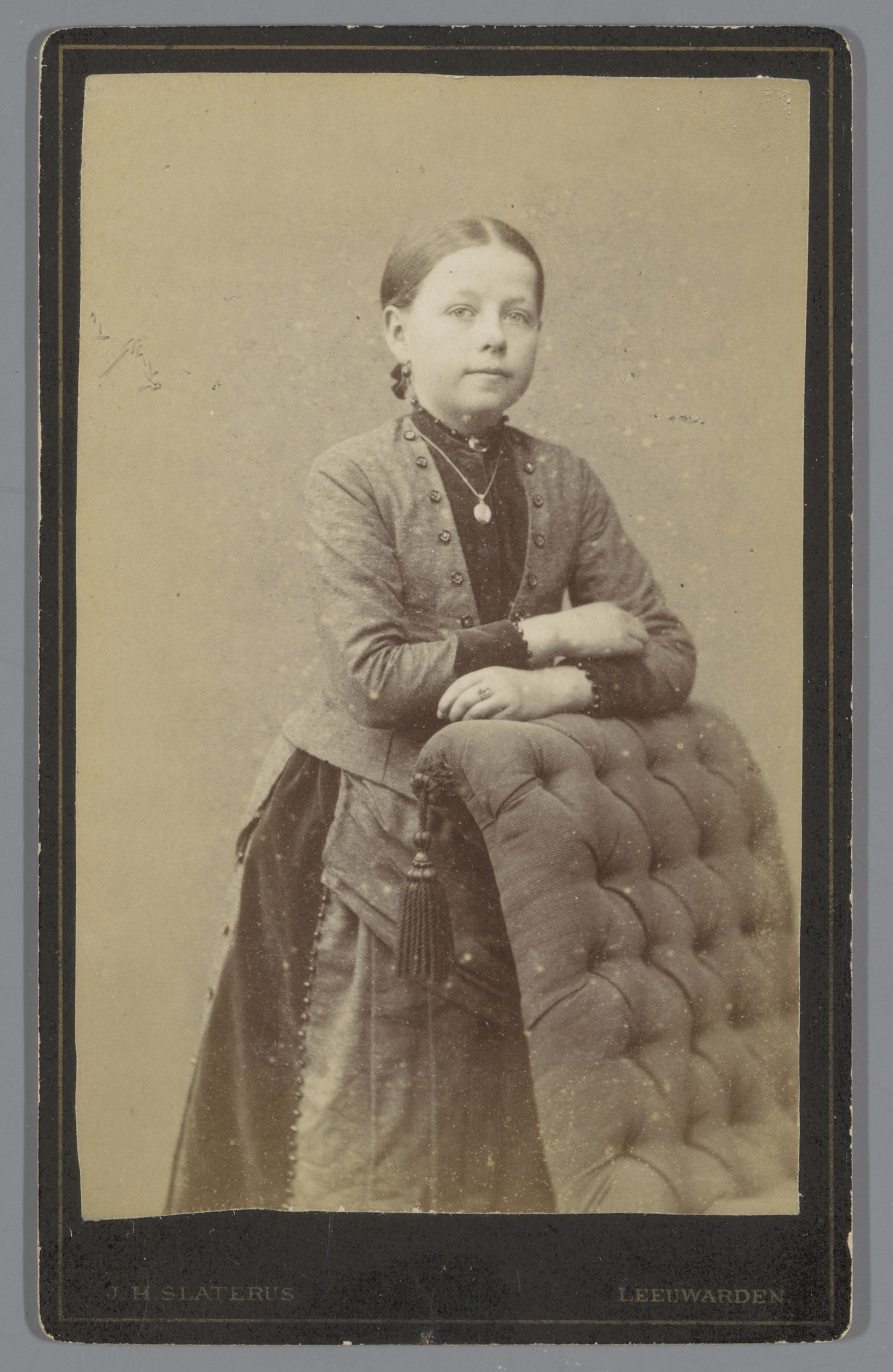 Portret van een onbekende jonge vrouw bij fauteuil