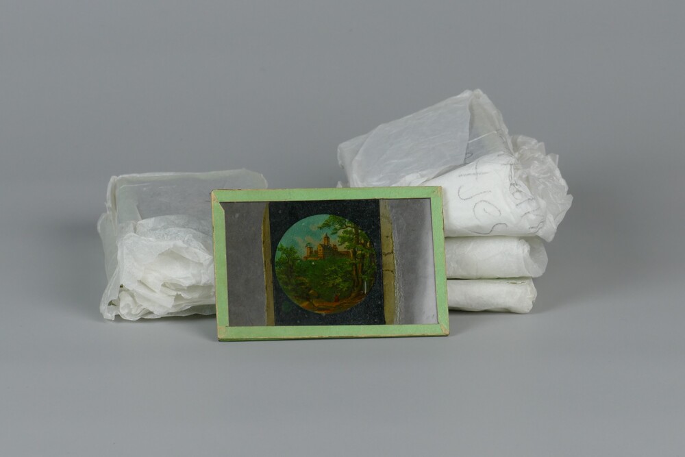 Toverlantaarnplaatjes van glasplaat met voorstelling.