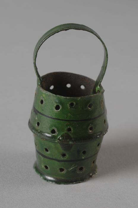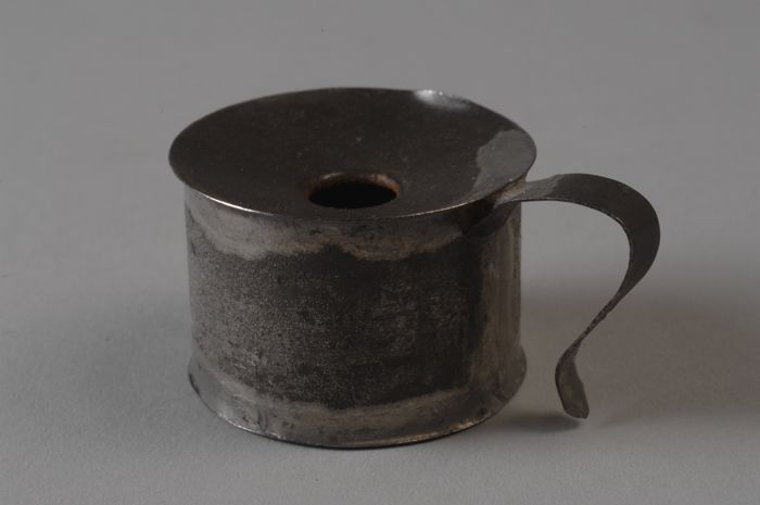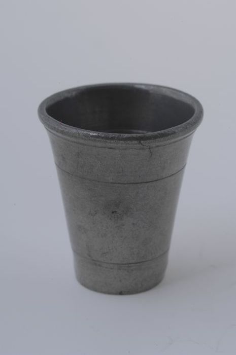 Tinnen miniatuur kwispedoor, potje met handvat en bo...