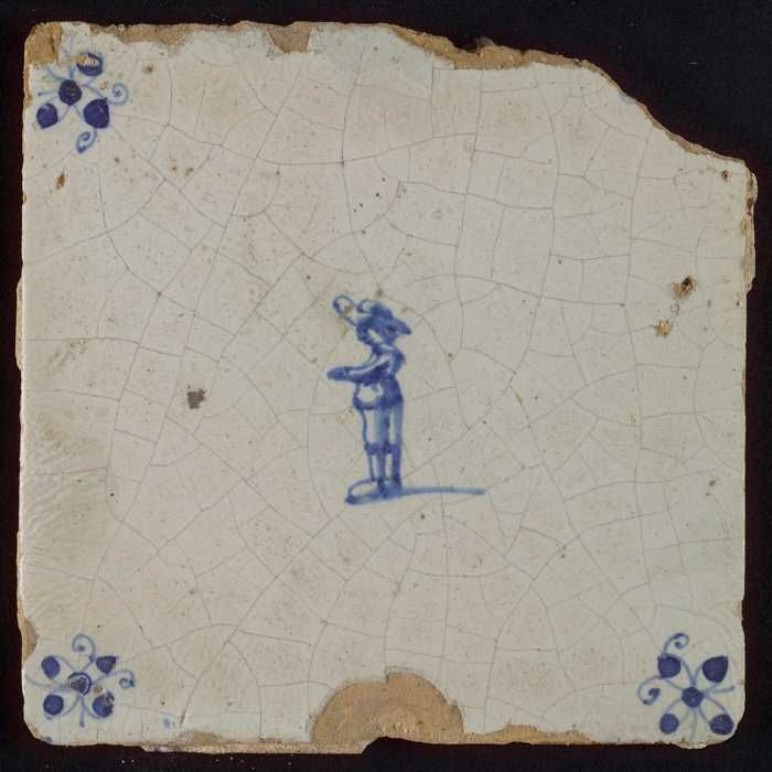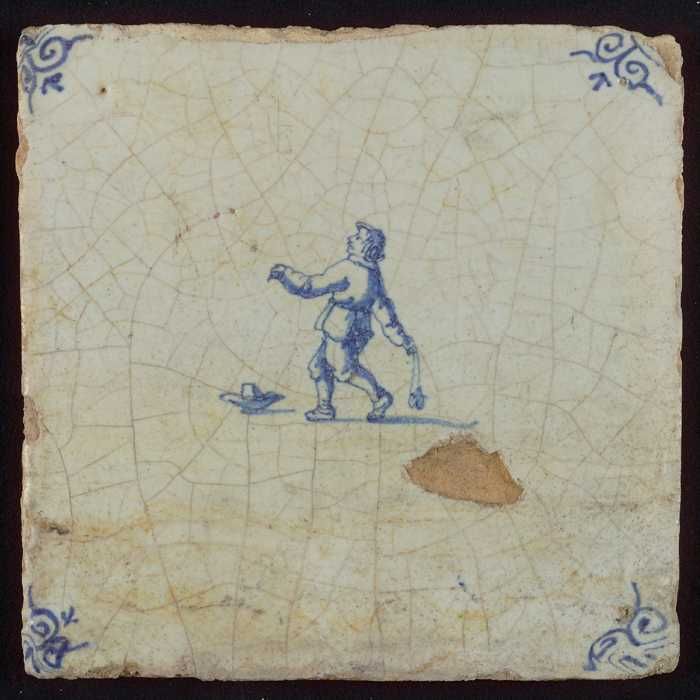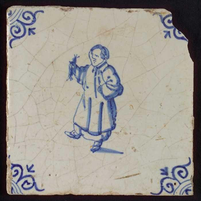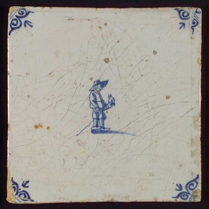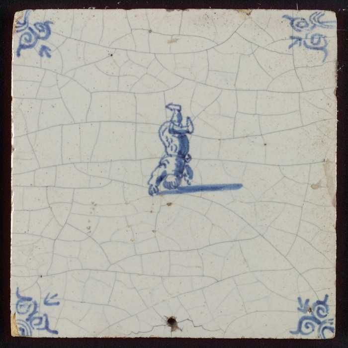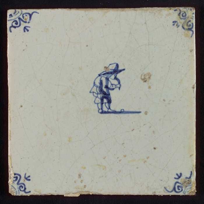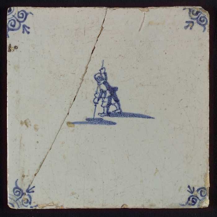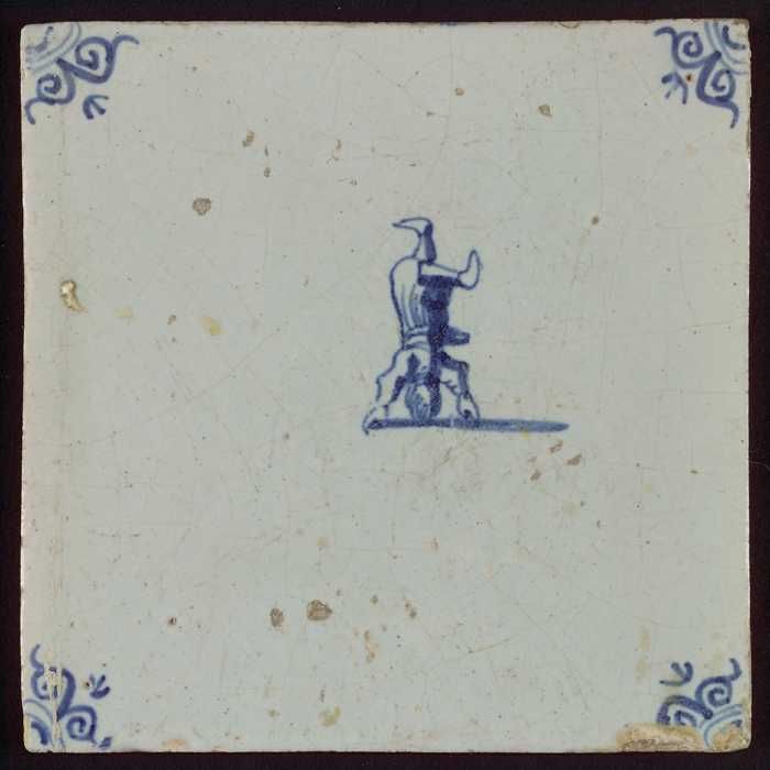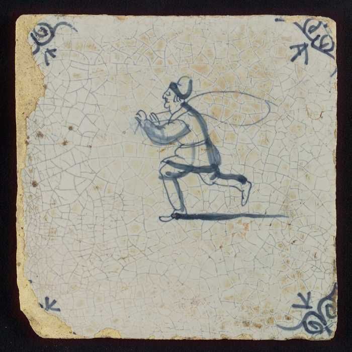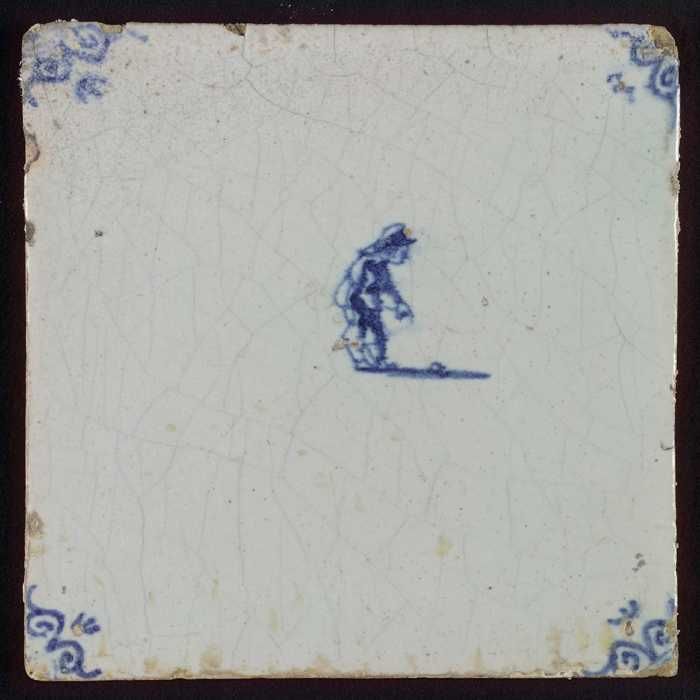 Figuurtegel, blauw, man met hark (?), hoekmotief oss...