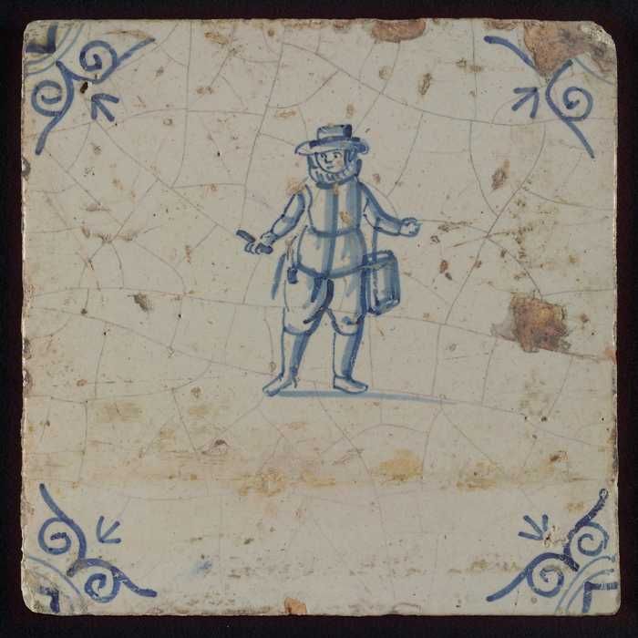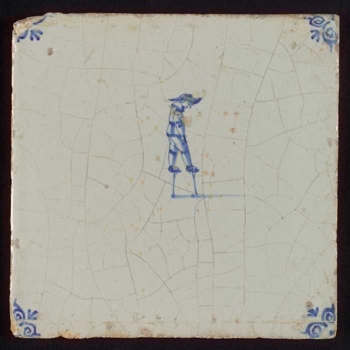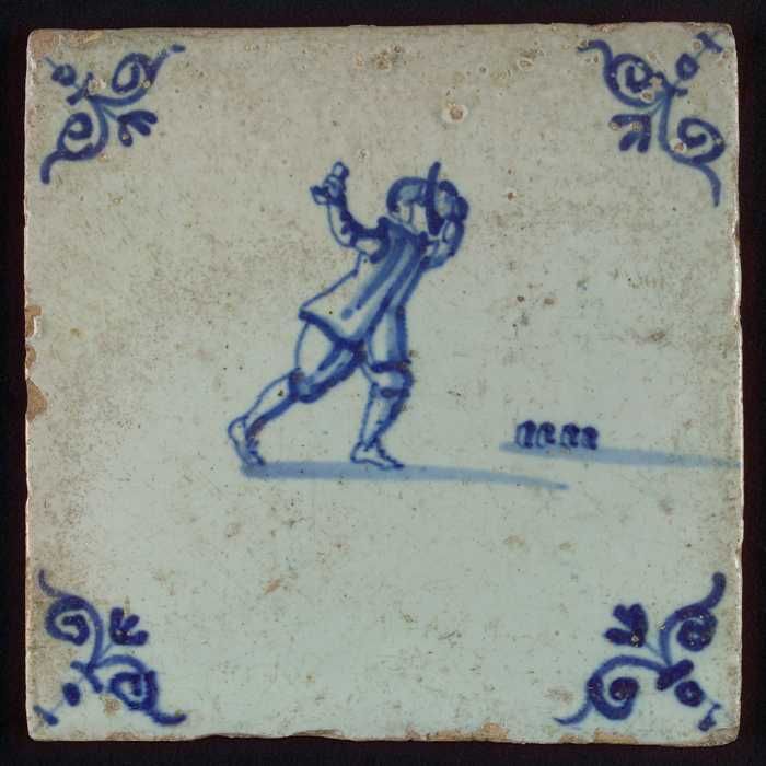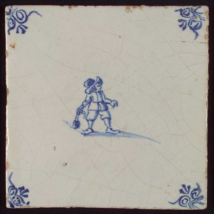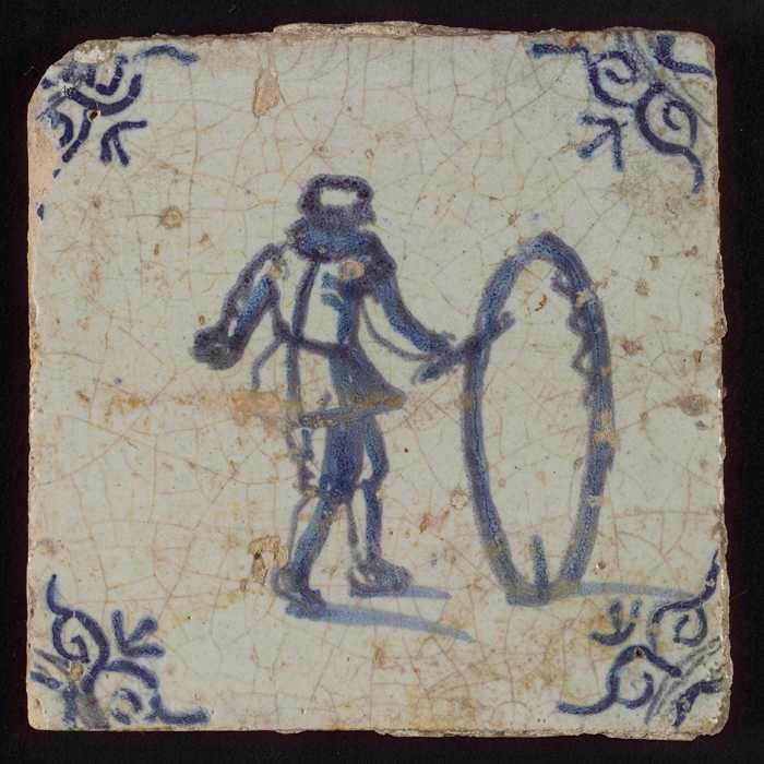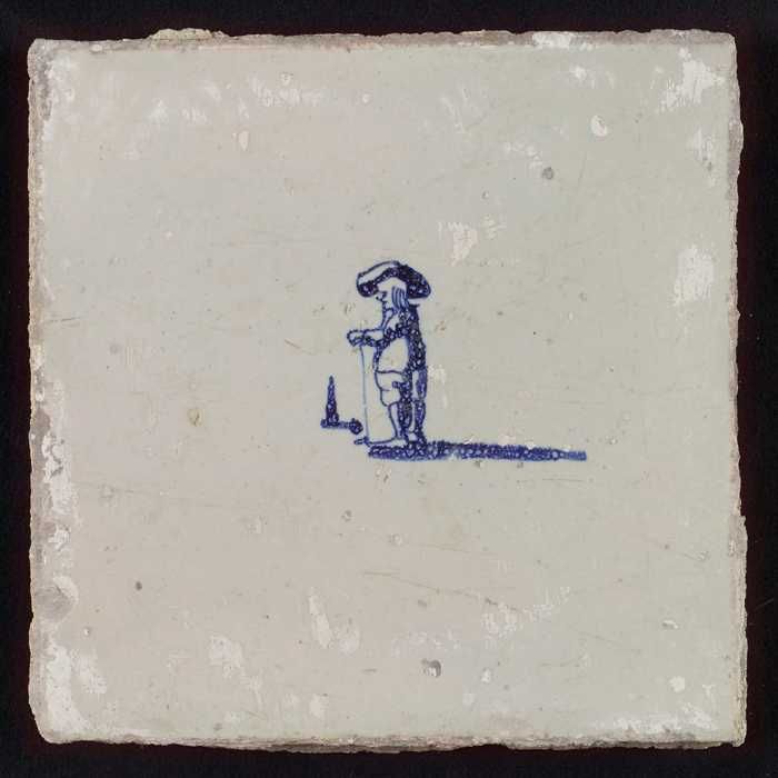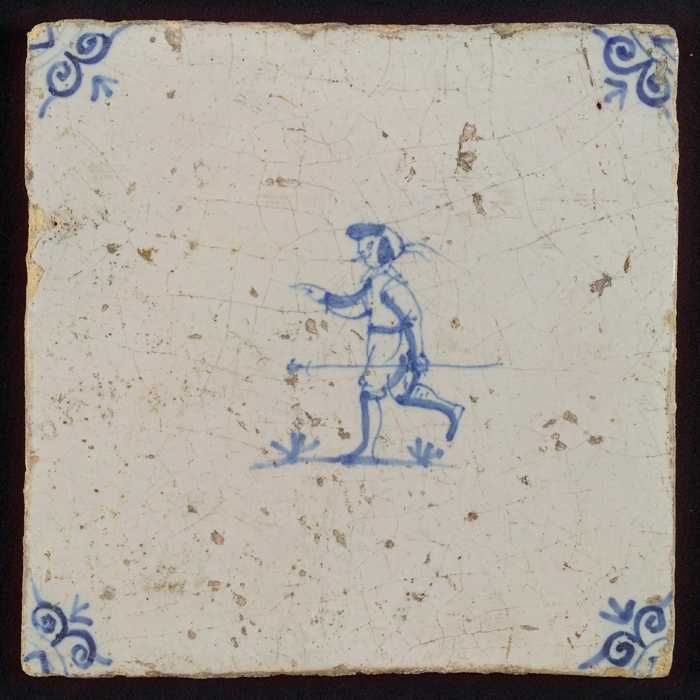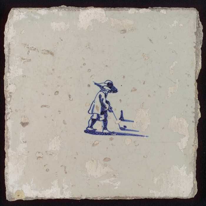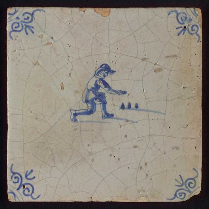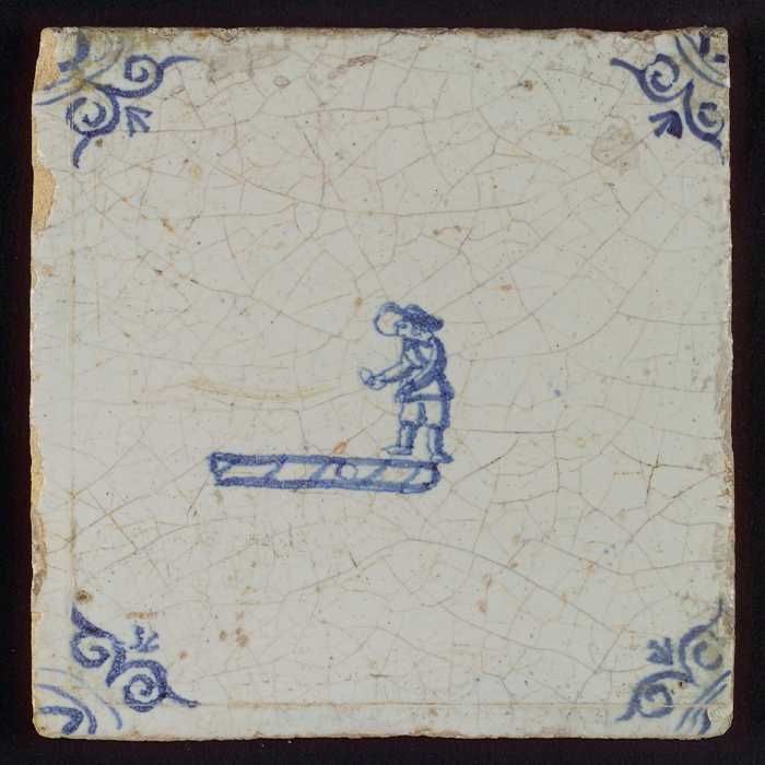 Figuurtegel, blauw, man met hark (?), hoekmotief oss...