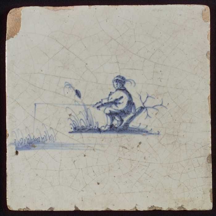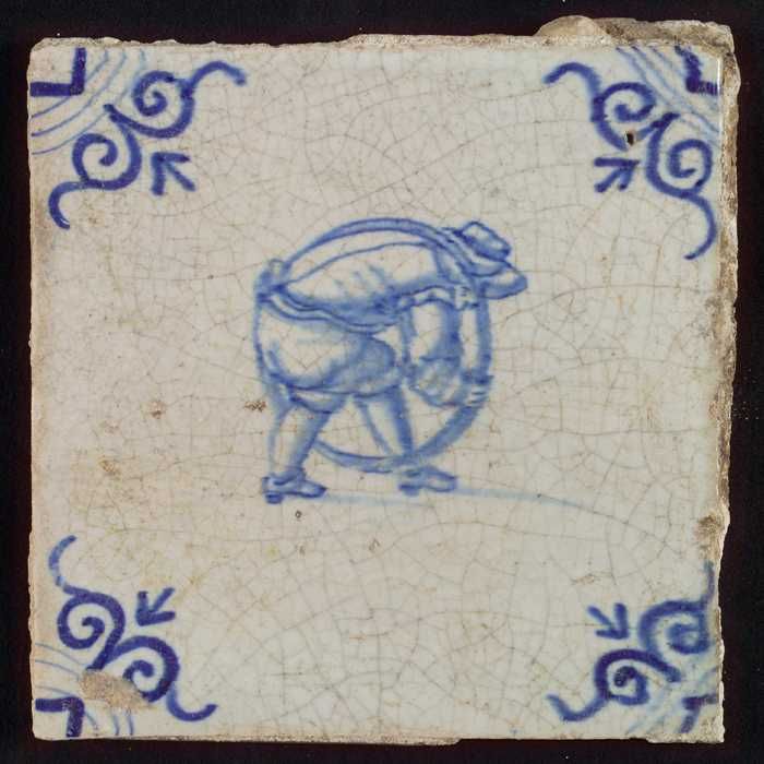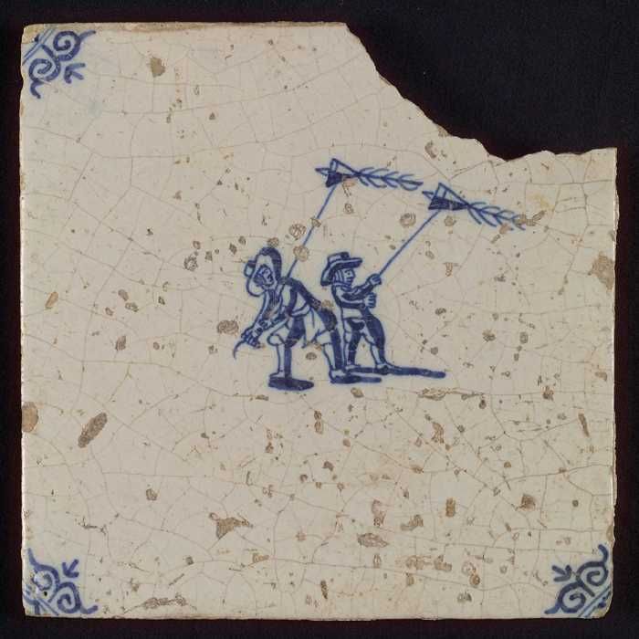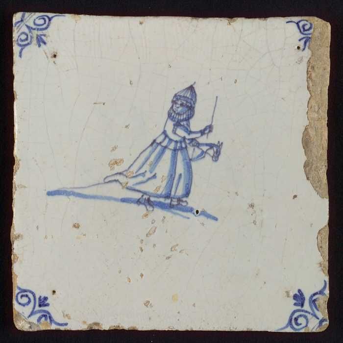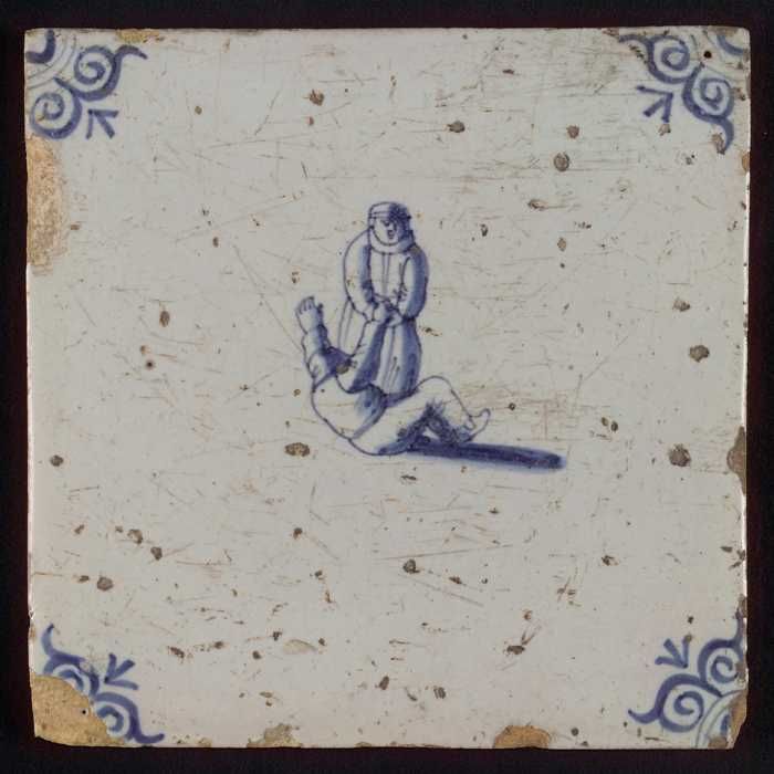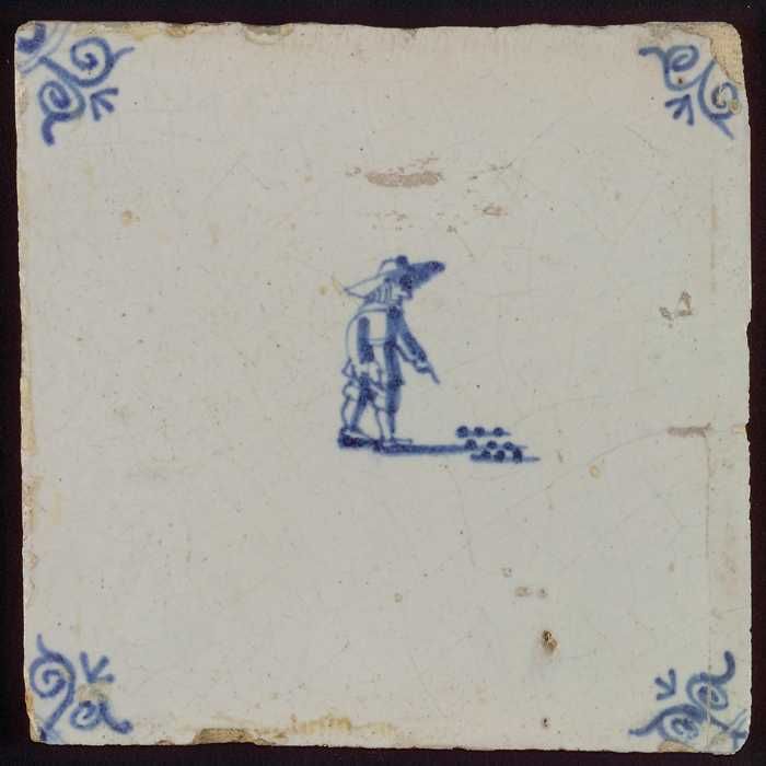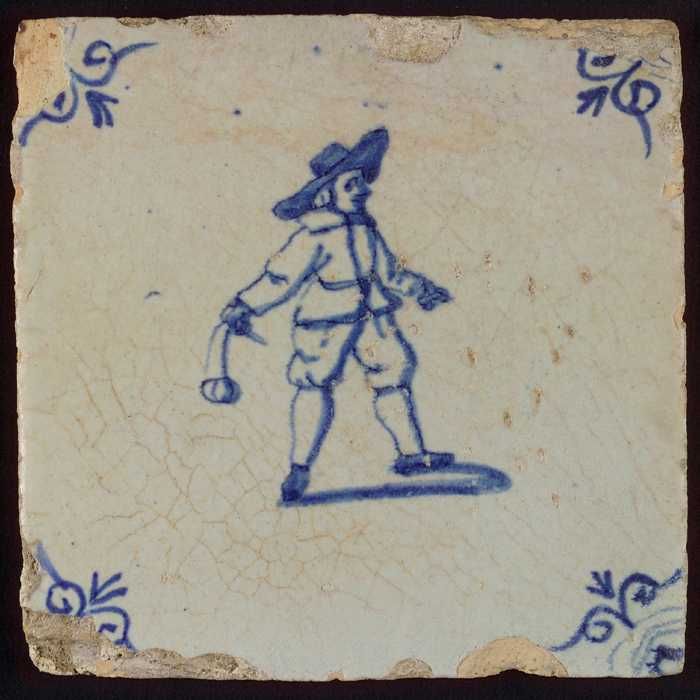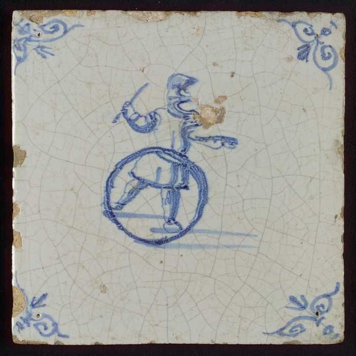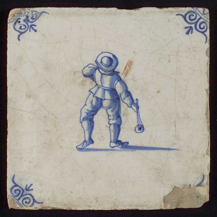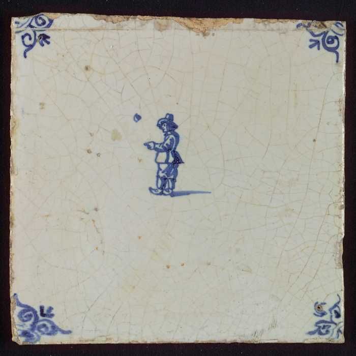 Figuurtegel, blauw, man met hark (?), hoekmotief oss...