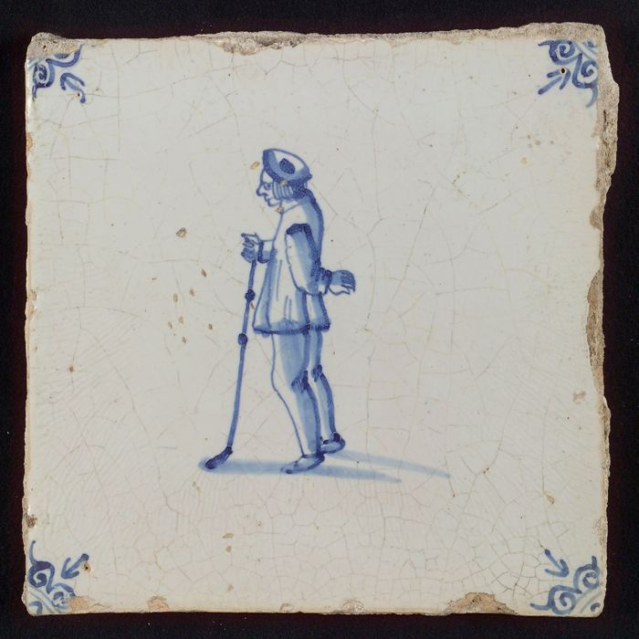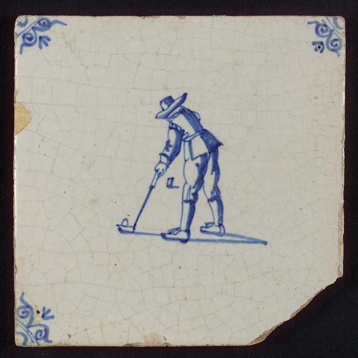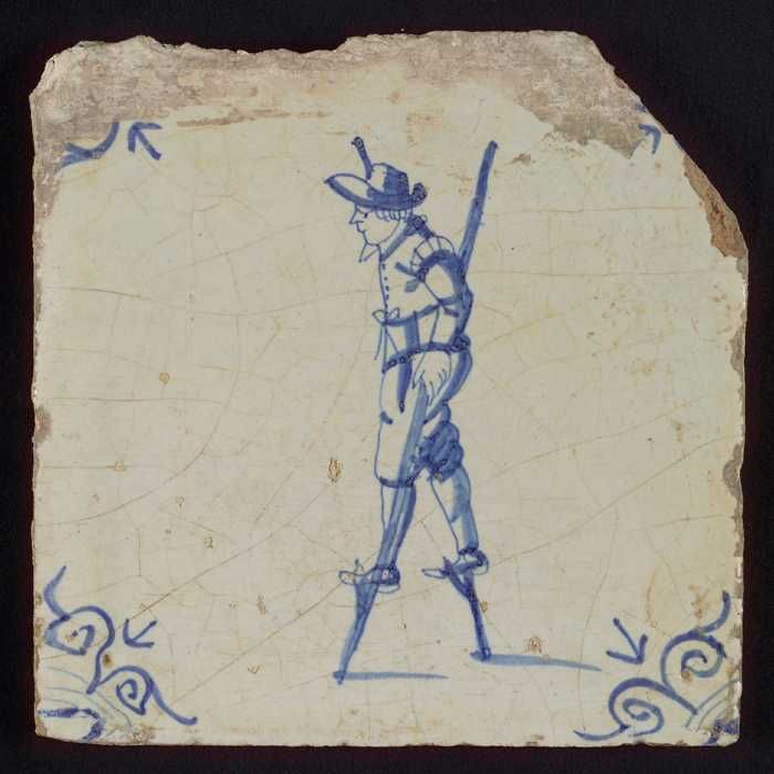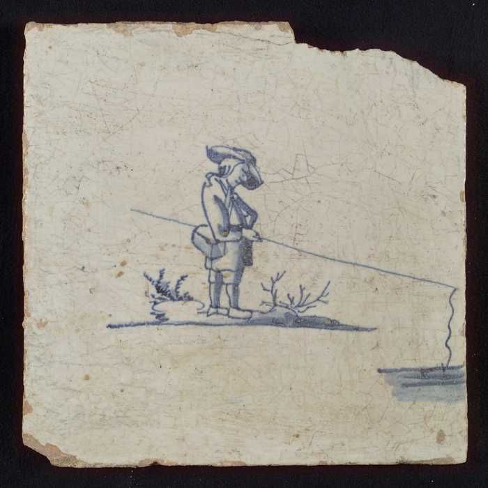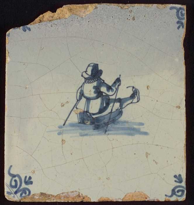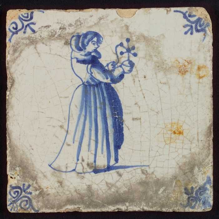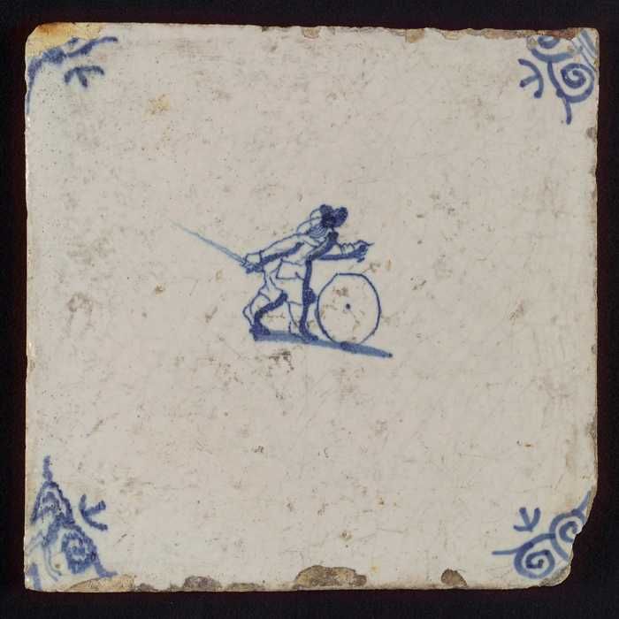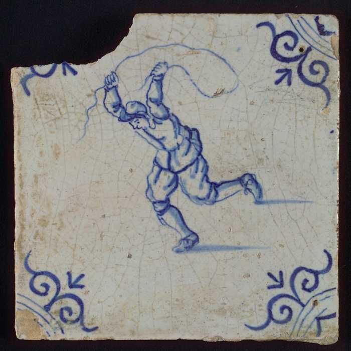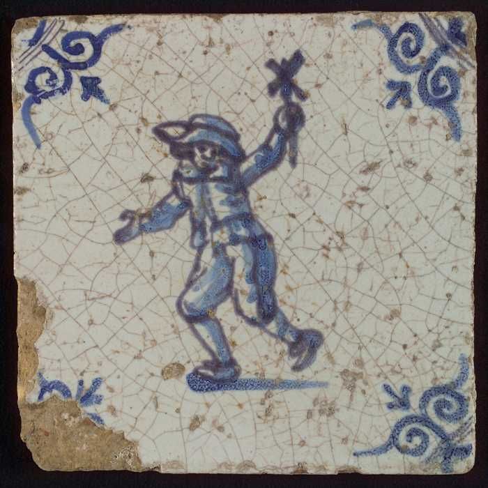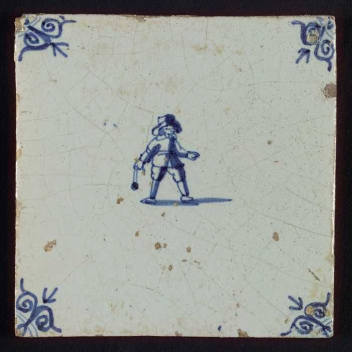 Figuurtegel, blauw, man met hark (?), hoekmotief oss...
