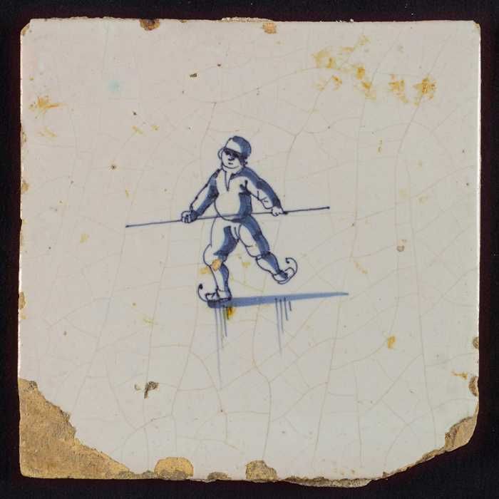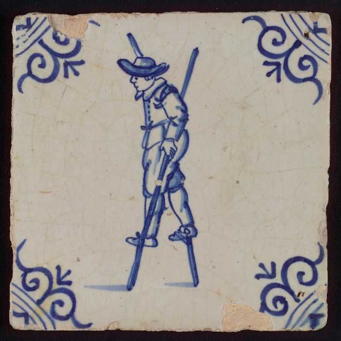 Tafereeltegel, kinderspel, kind op stelten, hoekmoti...