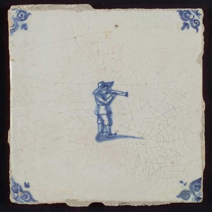 Tafereeltegel, man met trommel en stok, hoekmotief o...