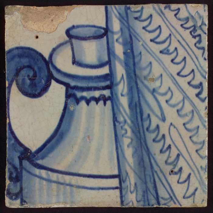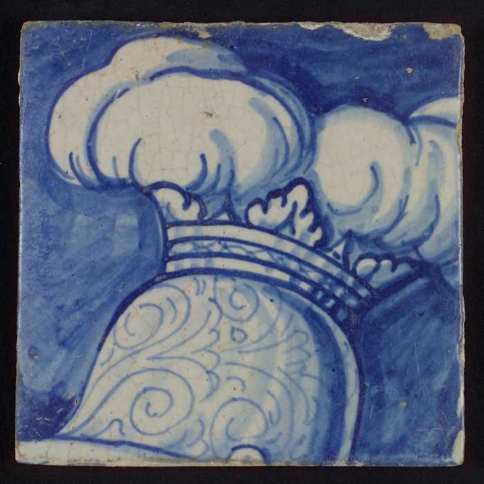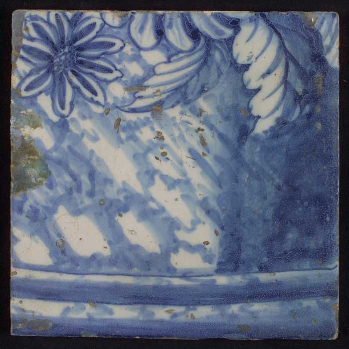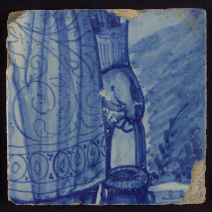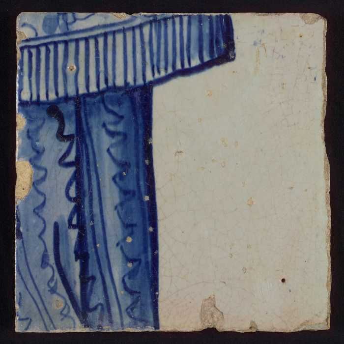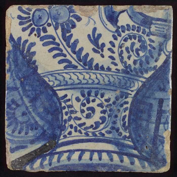 Tegel met in blauw gedecoreerde vaas (?) tegen blauw...